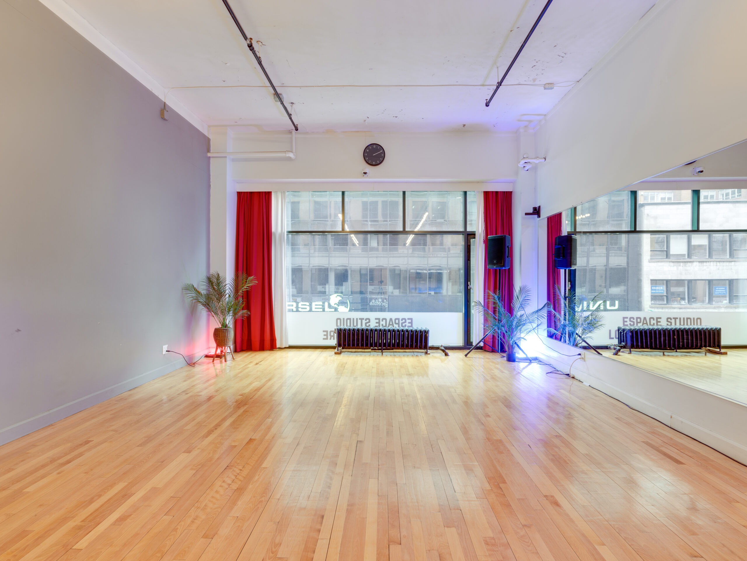 The studio spaces of Diss Torsion are strategically located in the heart of the Quartier des Spectacles in downtown Montréal. The large floor-to-ceiling windows of our studio spaces look directly onto Sainte-Catherine Street, (the main artery of the city) and are less than a block away from the entry to all of the year-round Festival events of the city. The view and location offer excellent visibility for your activities with thousands of passers by each day on St Catherine Street with the entry of the Quartier des Spectacles less than half a block away. The studio spaces are also less than 5 5-minute walk from metro Place des Arts and have a parking garage located in the basement of the building.